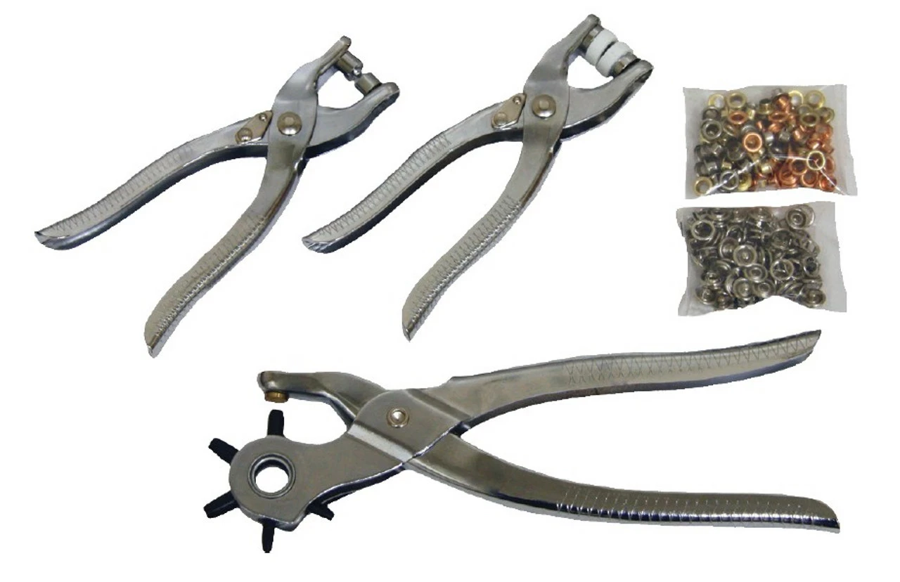 Pliers, 100 pc grommets, and 100 pc button snaps