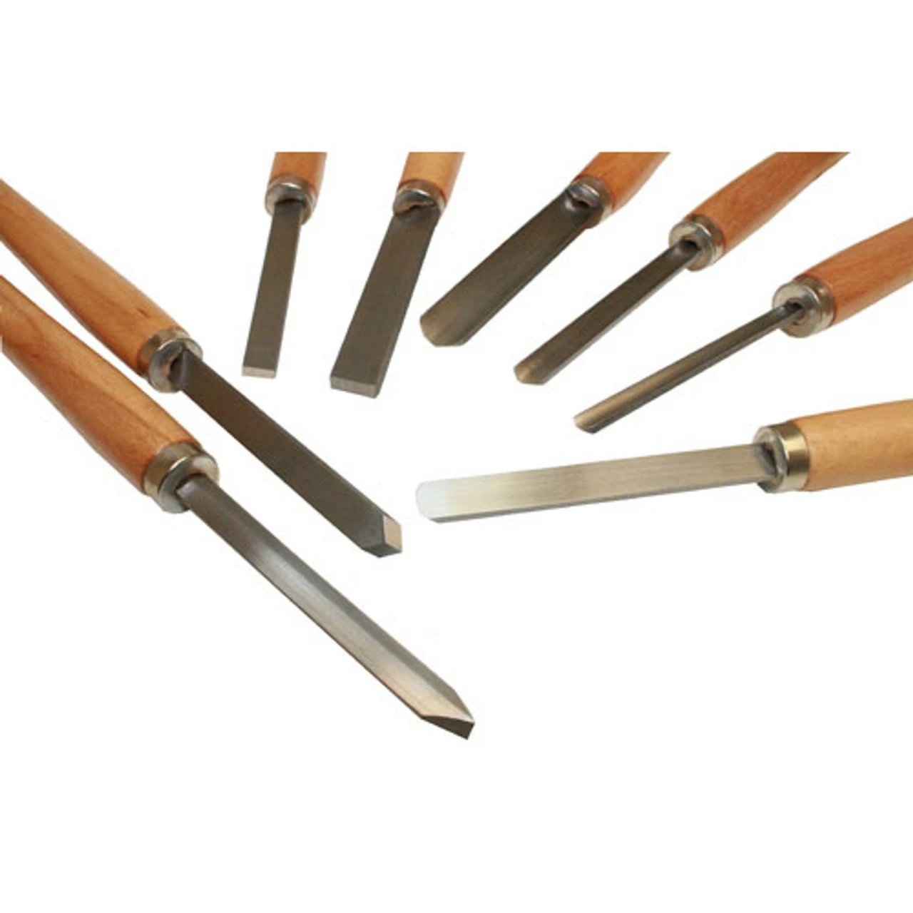 The set comes with 3/16″ parting tool, 5/8″ spear scraper, 1″ skew chisel, 5/8″ skew chisel, 5/8″ round nose scraper, 1/2″ bowl gouge, 3/4″ spindle gouge and 7/8″ roughing gouge in a box.