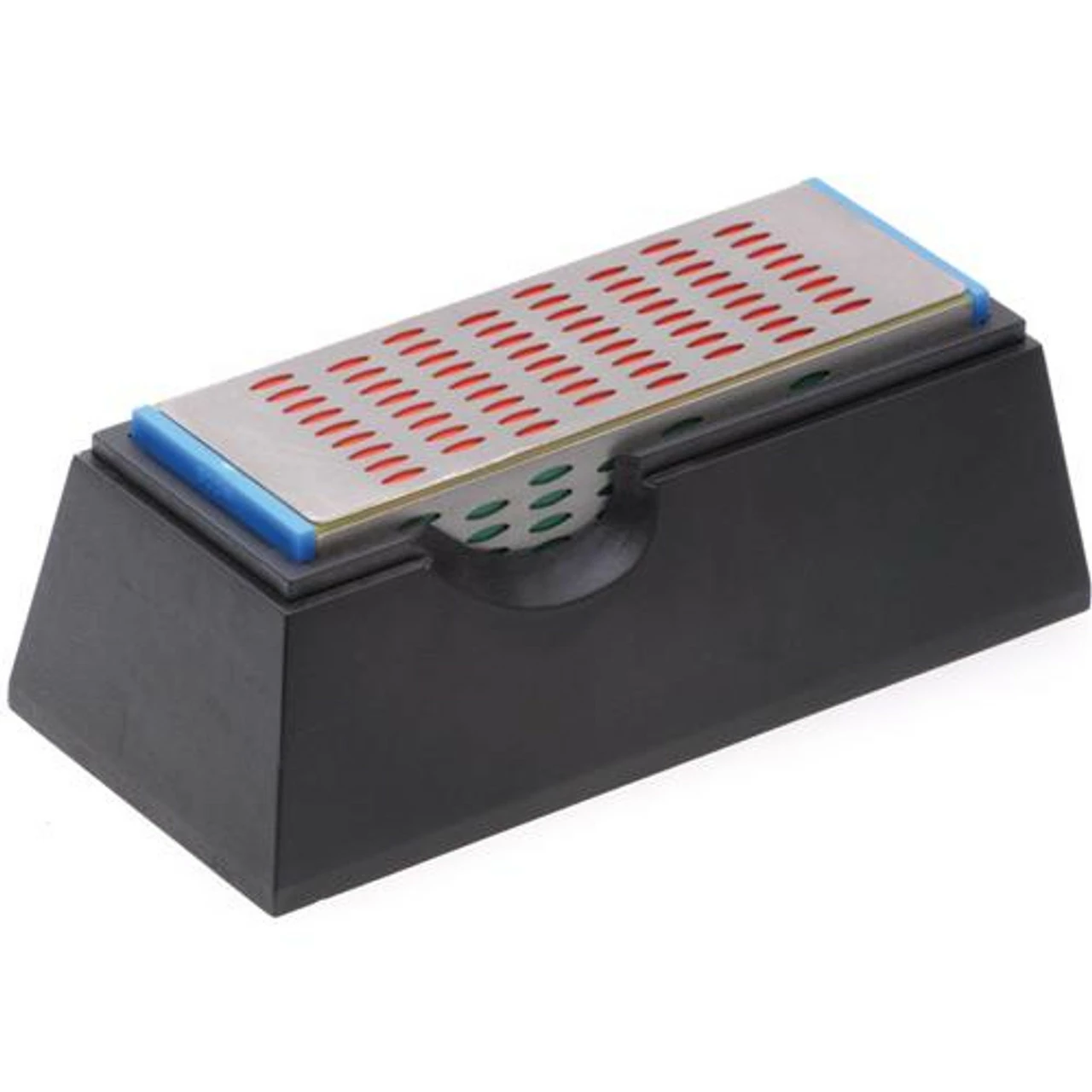 Rotate the diamond hone to expose four different grits for any flat sharpening need. Color coded honing surfaces measure 2″ x 6″ and include 200, 300, 400, and 600 grit. Just add water to clean and lubricate for very efficient honing. Stand features slip resistant rubber feet.