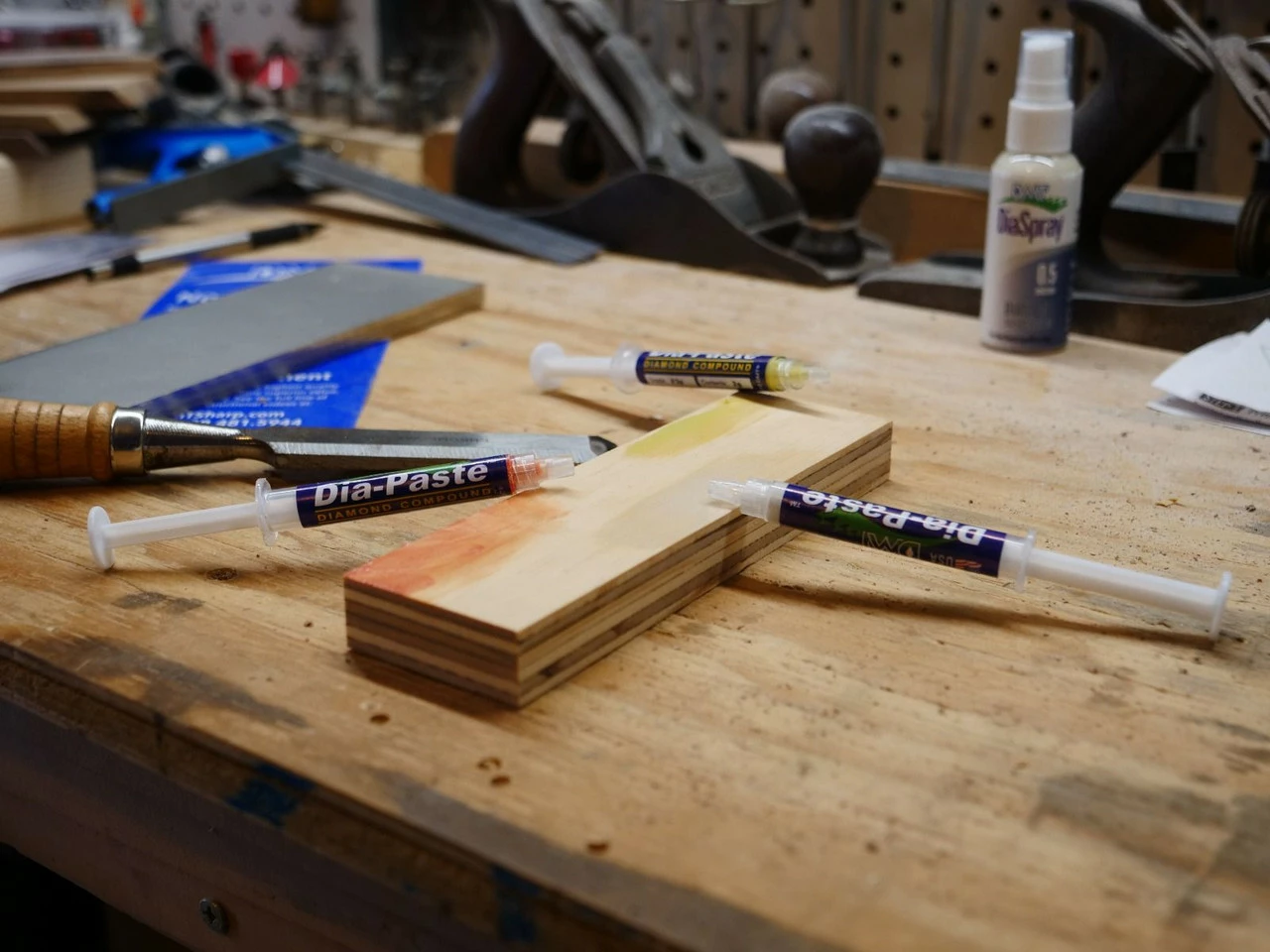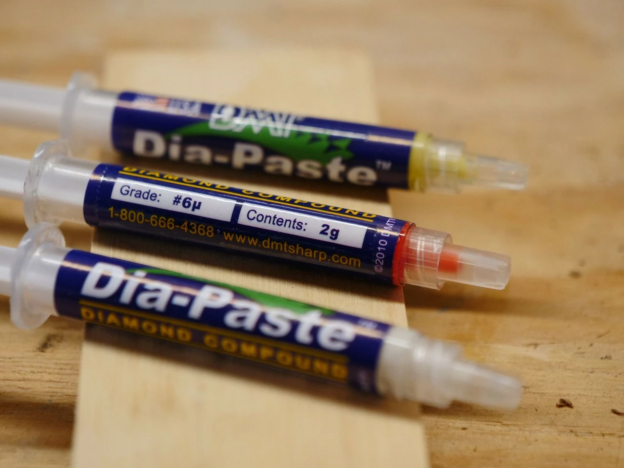 Improve tool performance with DMT’s easy-to-use Dia-Pasteβ’ Diamond Compound. A light application will create a highly polished, mirror finish, reducing tool friction for a sharper, stronger edge and allowing for more uses between sharpening. Packaged in convenient 2-gram syringes, this kit of 3 includes several specialized compounds for various edge treatments. First among these is a copper coded compound (6 micron / 4000 mesh) to remove scratches with light pressure polishing, followed by a yellow coded compound (3 micron / 8000 mesh) for a glossy bevel edge. Lastly, there is the gray-coded compound (1 micron / 15000 mesh) for the ultimate polished mirror bevel edge. For optimal results, apply the oil-based compound to a flat surface and using precise angle control, sharpen the tool against the surface with the applied compound. Made in the USA.