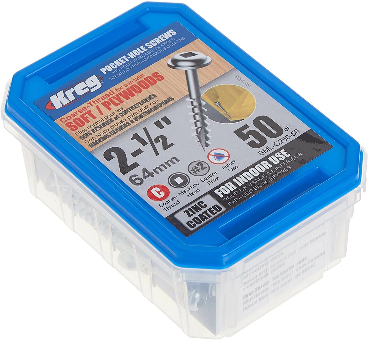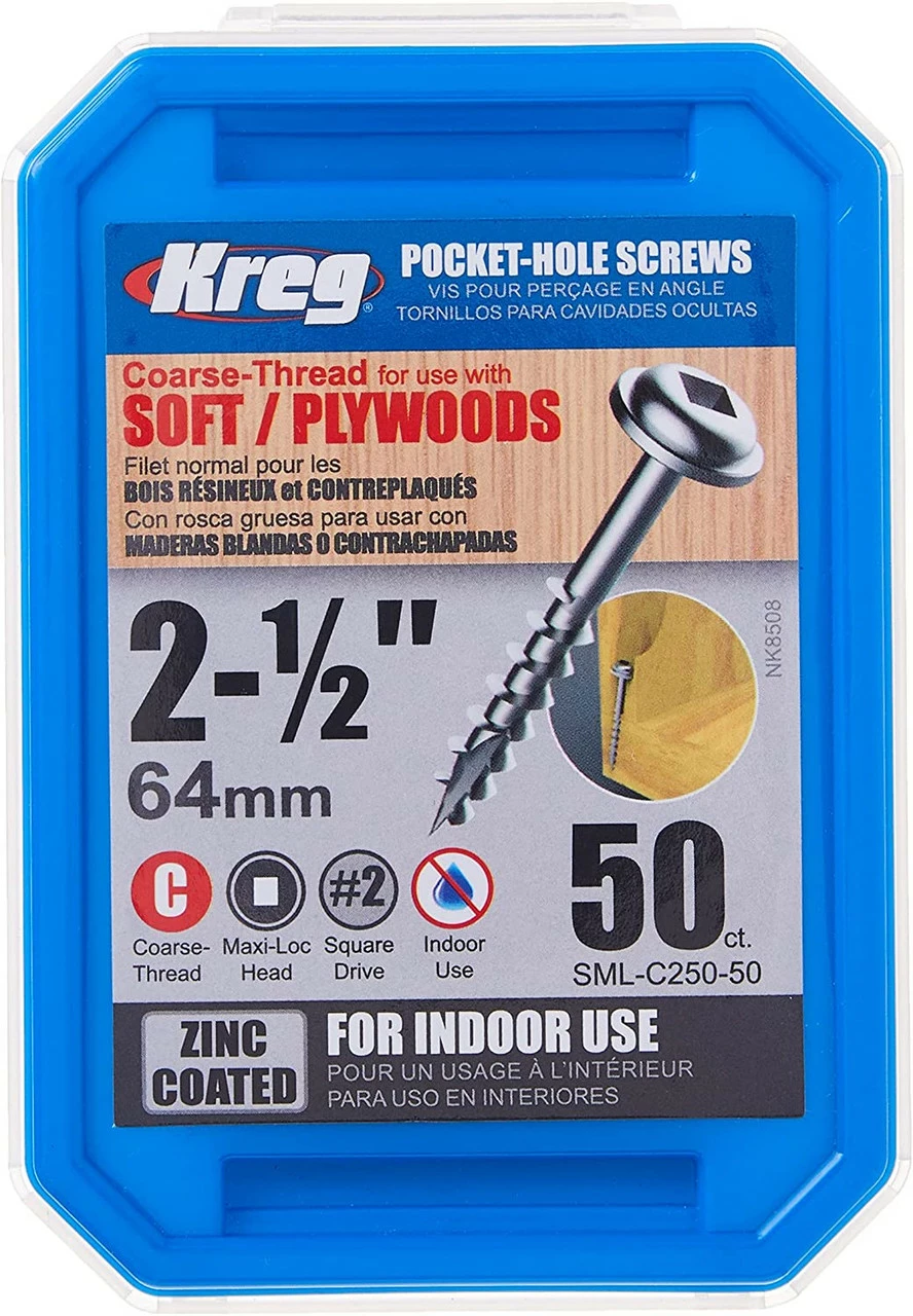This 2-1/2-inch coarse thread, #2 square drive washer-head screw works well in 1-1/2-inch-thick material. The washer head of this screw is our most popular head style as the wide bearing surface of the head will not overdrive in the bottom of the pocket. This is especially important in softer materials like plywood and composite. The screw also features a type-17 auger tip that self-taps its own hole, eliminating the need to pre-drill, in even the hardest materials. Kreg screws also have larger-diameter steel shanks than many other screws on the market today, making for an impressively strong screw that is almost impossible to break. Our screws have a bronze-colored finish and a dry-lubricant coating that eases driving torque and provides greater rust resistance. For maximum rust resistance, look to our Sun-Seal coated weather resistant screws.
