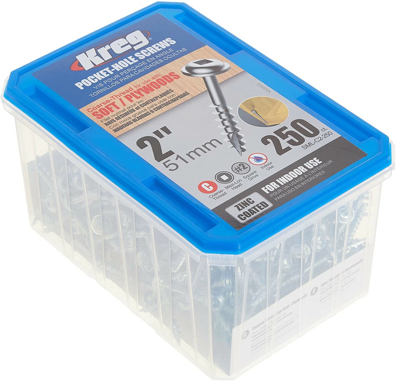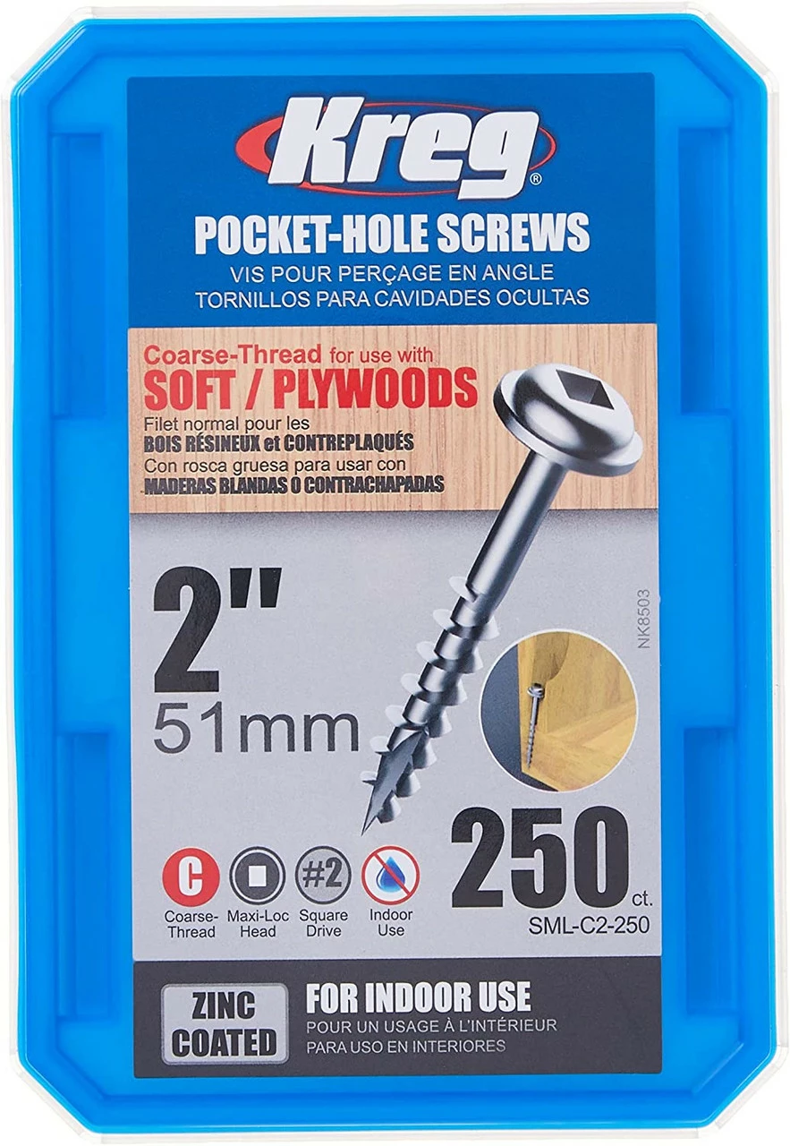 This 2″ coarse thread, #2 square drive washer head screw works well in softer material. The washer head of this screw is our most popular head style as the wide bearing surface of the head will not overdrive in the bottom of the pocket. This is especially important in softer material such as plywoods and composites. The screw also features a type 17 auger tip that self-taps its’ own hole, eliminating the need to predrill in even the hardest materials. Kreg screws also have larger diameter steel shanks than many other screws on the market today making for an impressively strong screw that is almost impossible to break. Our screws have a zinc finish and a dry-lubricant coating that eases driving torque and provides greater rust resistance. For maximum rust resistance, look to our Sun-Seal coated weather resistant screws.