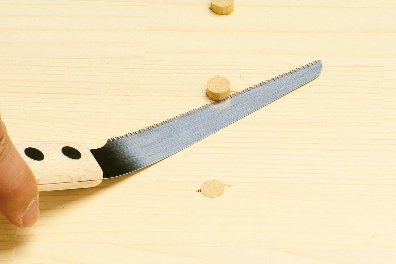 The blade width decreases towards the tip. Great for working in a narrow space. Fine teeth with teeth pitch 1.0mm. The blade width is smaller towards the tip. You can cut small things, so it’s great for craft work. The blade is only 0.3mm thick and is flexible. You can stabilize the saw by putting the handle on the material you are cutting. You can cut dowels this way. Since the handle is made of wood, it will not leave any damages or marks on the material.